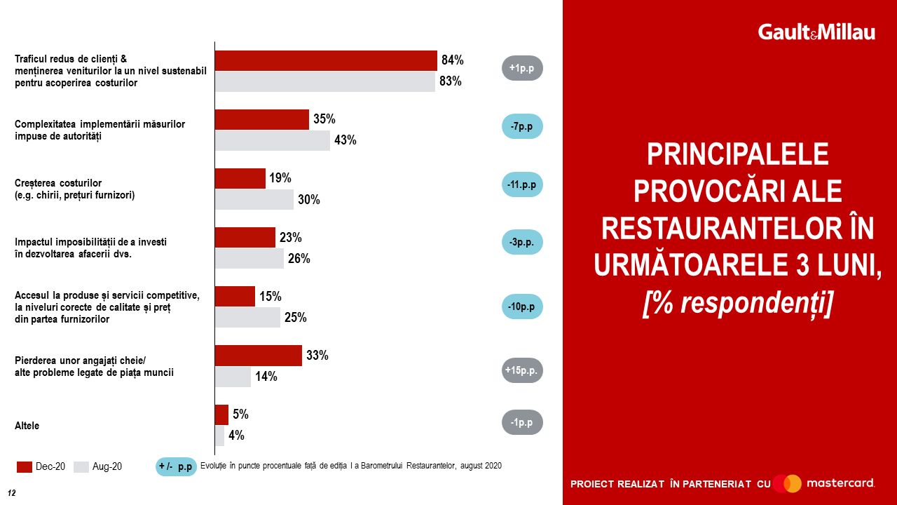 între provocări este vizibilă și complexitatea implementării măsurilor de siguranță impuse de autorități (35%, în scădere de la 43%) dar și pierderea unor angajați cheie (33%, în creștere de la 14%). Creșterea costurilor (19%) și accesul la servicii competitive (15%) par să reprezinte provocări mai reduse momentan, arătând o stabilizare a pieței la noile condiții.