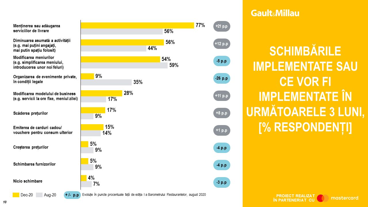 Una dintre cele mai clare schimbări este că momentan, 77% din restaurante au adăugat sau vor adăuga servicii de livrare (serviciu așteptat să fie păstrat și în 2021, indiferent de data redeschiderii restaurantelor la interior), în timp ce 56% își vor diminua asumat activitatea (e.g. mai puțini angajați, mai putin spațiu folosit) și 54% au modificat sau vor modifica meniurile (noi feluri de mâncare, simplificare listă feluri propuse, uneori și eliminarea unor feluri mai sofisticate). Este interesant de observat dublarea ponderii restaurantelor care prevăd scăderi de prețuri (de la 9% la 17%).