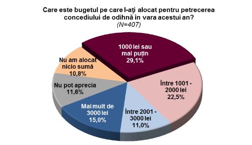În ceea ce privește bugetul alocat concediului de odihnă, acesta a fost, în medie, de 1.690 lei. Astfel, 29,1% dintre persoanele intervievate au alocat pentru vacanța de vară o sumă de 1.000 de lei sau mai puțin, 22,5% o sumă cuprinsă între 1.001″ 2.000 lei, 11,0% între 2.001″3.000 lei, iar 15,0% au avut un buget mai mare de 3.000 de lei.