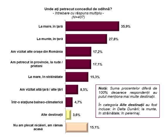 Circa 77% dintre persoanele din mediul urban, active pe piața muncii, au avut concediu de odihnă în perioada iunie – august 2013, cei mai mulți dintre aceștia alegând pentru petrecerea concediului, destinații din România, primul loc în topul destinațiilor ocupându-l litoralul (35,9%), apoi stațiunile montane (27,8%) și vizitarea altor orașe (17,2%), potrivit celui mai recent studiu realizat de Mednet Marketing Research Center.