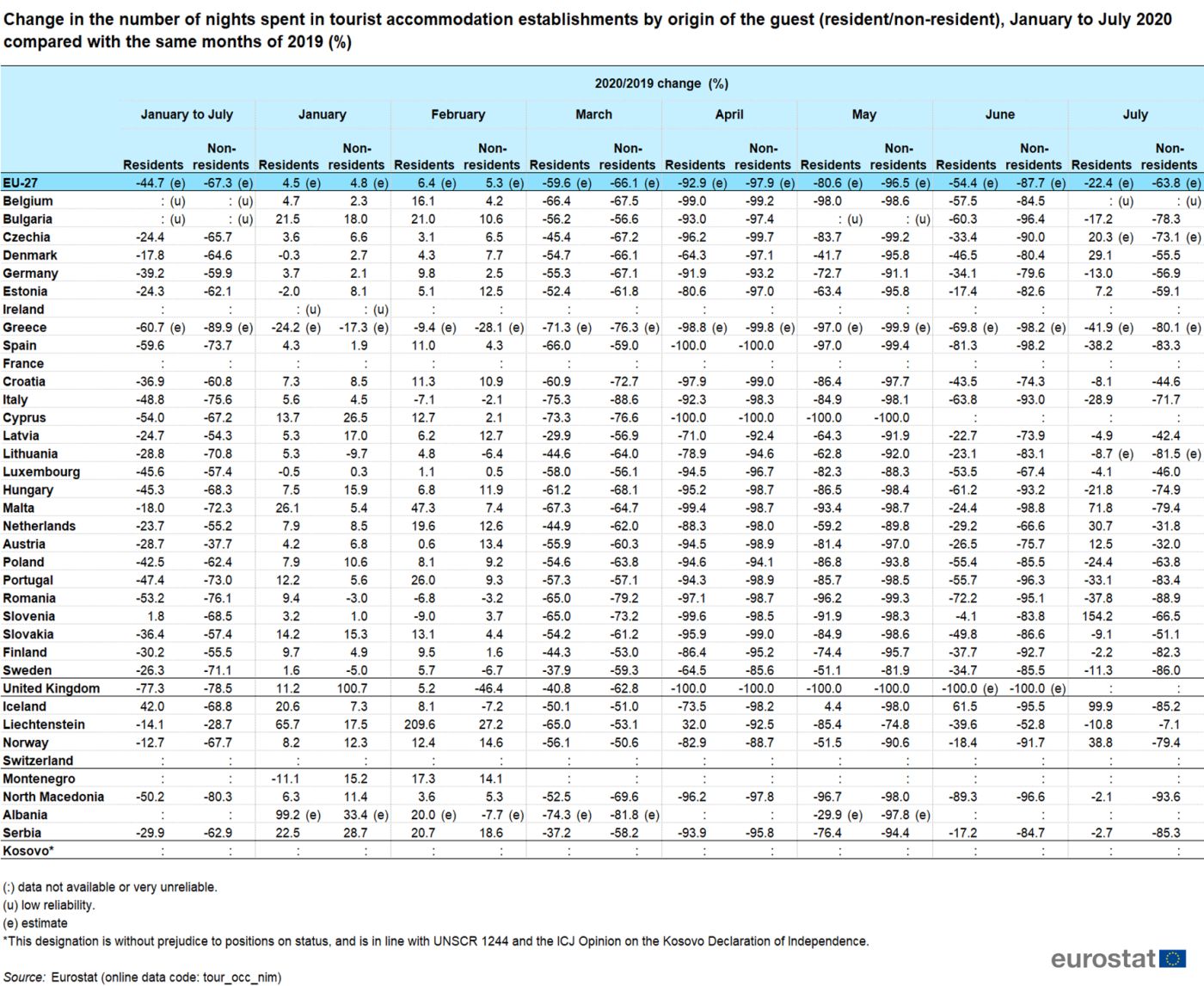 în iulie 2020, rezidenții din Cehia, Danemarca, Estonia, Malta, Èšările de Jos, Austria și Slovenia au petrecut mai multe nopți în structurile de cazare turistică din țara lor decât în aceeași lună a anului anterior.