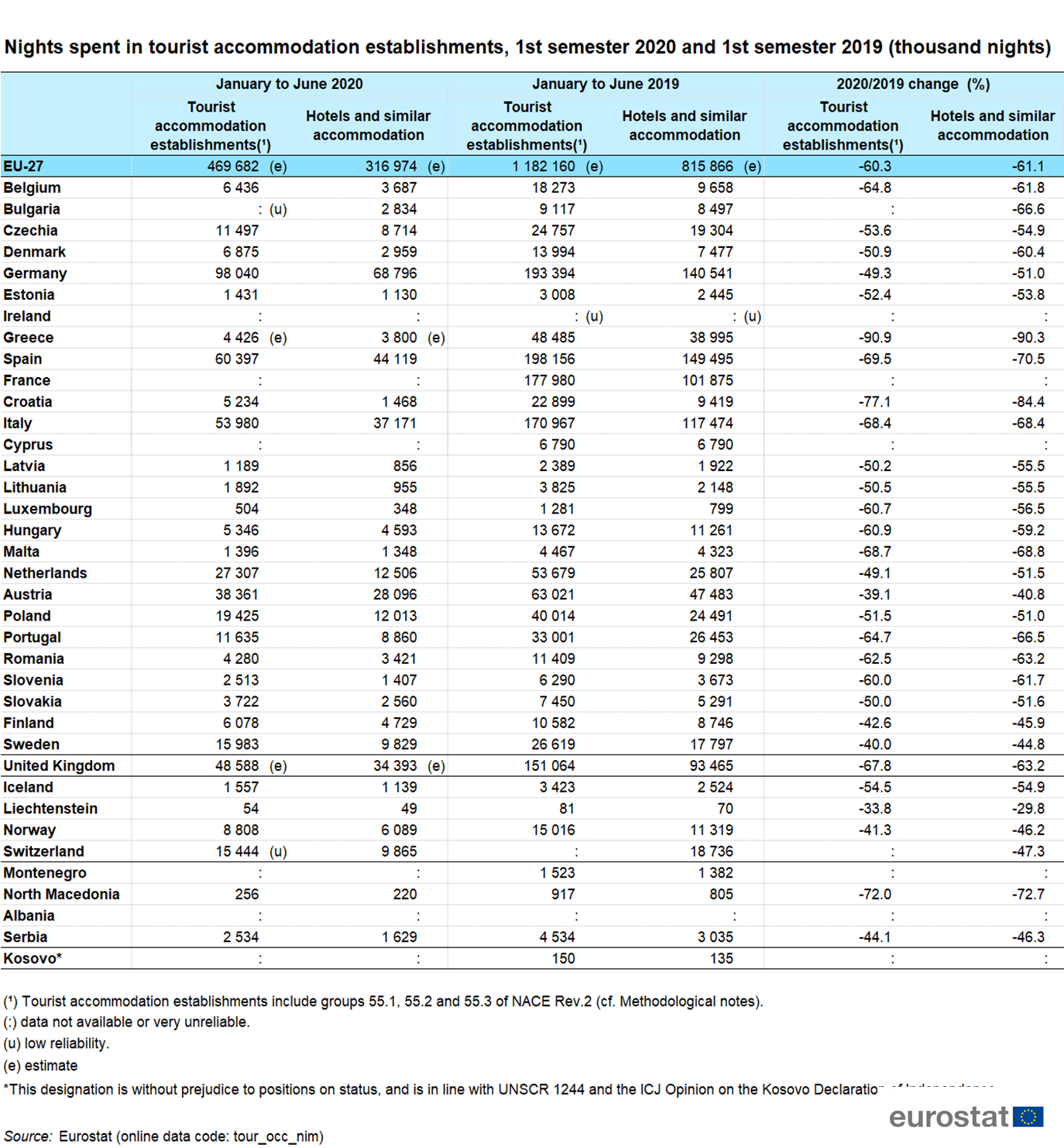 Numărul nopților petrecute în structurile de cazare turistică din Uniunea Europeană a scăzut dramatic în primul semestru al acestui an, comparativ cu primul semestru al anului trecut, de la 1,2 miliarde în 2019 la mai puțin de 0.5 miliarde în 2020, ceea ce înseamnă o scădere de 60%, a anunțat Eurostat, biroul de statistică al Comisiei Europene.