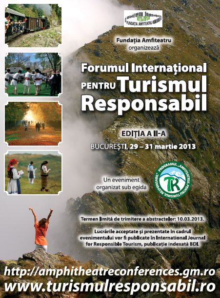 A doua ediție a Forumului Internațional pentru Turismul Responsabil se va desfășura în București, în perioada 29-31 martie, anunță organizatorii evenimentului, Fundația Amfiteatru, și are ca scop promovarea conceptului de turism responsabil în rândul operatorilor de turism din țara noastră.