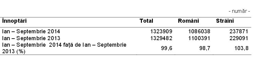 Astfel, dacă în primele 9 luni ale anului trecut în unitățile de cazare din județ se înregistrau 1,329 milioane înnoptări, în aceeași perioadă a anului în curs numărul înnoptărilor a scăzut la 1,323 milioane înnoptări.