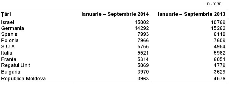 Principalele țări de proveniență ale turiștilor străini în perioada ianuarie – septembrie 2014 comparativ cu ianuarie – septembrie 2013, au fost: