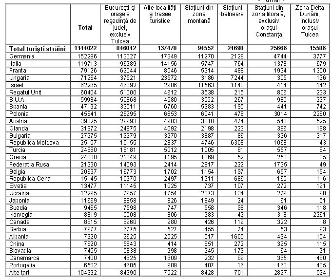 Sosirile vizitatorilor străini în România, înregistrate la punctele de frontieră, au fost în primele 10 luni ale acestui an de 7,981 milioane, în creștere cu 9,9% față de perioada similară a anului trecut Majoritatea vizitatorilor străini provine din țări situate în Europa (92,8%). Din totalul sosirilor vizitatorilor străini în România, 57% provin din statele Uniunii Europene. Dintre statele Uniunii Europene cele mai multe sosiri s-au înregistrat din Ungaria (31%), Bulgaria (27,8%), Germania (8,4%), Polonia (7,1%), Italia (5,8%) și Austria (3,5%) .