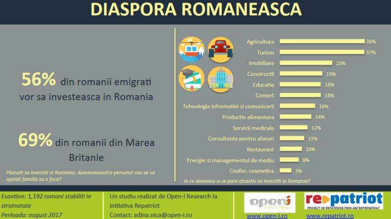 56% dintre românii emigrați vor să investească în România, considerând că cele mai atractive domenii sunt turismul (37%) și agricultura (38%), însă principala lor barieră este corupția din România, conform rezultatelor celui mai amplu studiu despre diaspora românească, comandat de RePatriot și realizat de Open-I Research.