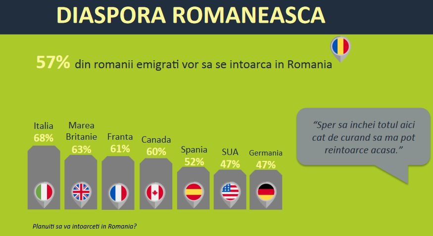 Potrivit studiului, 57% dintre românii emigrați vor să se întoarcă în țară; în funcție de țara de emigrație, cele mai mari procente se înregistrează în Italia (68%) și Marea Britanie (63%), iar cele mai mici în Germania și Statele Unite (43%).