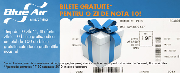 in perioada 17-30 noiembrie 2010, Blue Air ofera zilnic 10 bilete gratis, in total 100 de bilete gratis, catre toate destinatiile companiei, pentru cei care rezerva in aceasta perioada un zbor Blue Air. Campania¾Bilete gratuite pentru o zi de nota 10†lansata de Blue Air are ca perioada de calatorie 1 decembrie 2010- 31 martie 2011.