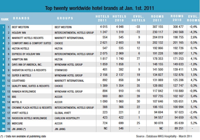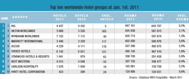 Clasamentul realizat de MKG Hospitality scoate la iveală câteva schimbări interesante în topul celor mai mari grupuri hoteliere din lume. La data de 1 ianuarie 2011, patru grupuri hoteliere au trecut pragul de 600.000 de camere operaționale în întreaga lume, datorită unei strategii de dezvoltare focusată pe franciză. Acestea sunt: IHG, Hilton Worldwide, Wyndham Worldwide și Marriott International.
