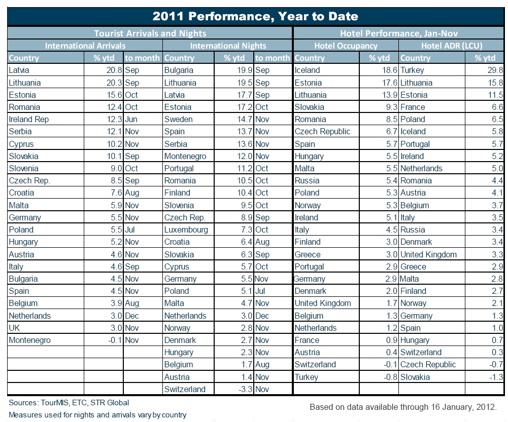Cele mai performate companii din industria de travel în 2011 au fost cele aeriene dar și companiile hoteliere. În primele 11 luni ale anului trecut, companiile aeriene din Europa au servit cu 5% mai mulți pasageri ca în 2010, iar hotelurile au indicat o creștere de 3,2% a gradului de ocupare. „În mod impresionant, 22 din 23 de țări raportoare au înregistrat o creștere a numărului de turiști în 2011, creșterea variind de la 3% în Marea Britanie, la peste 20% în Latvia și Lituania. De asemenea 24 din 26 de țări au înregistrat creșteri ale gradului de ocupare în hoteluri, în 2011”, se arată în raport.