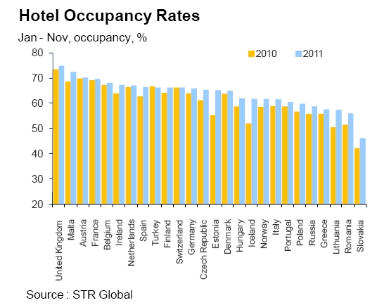 În ceea ce privește industria hotelieră, cele mai mari creșteri ale gradului de ocupare în hoteluri în 2011 s-au înregistrat în Europa de Sud-Est. În ceea ce privește indicatorul RevPAR, s-a înregistrat de asemenea o creștere de 6% în primele 11 luni ale anului trecut la nivel european. Totuși, aproape jumătate dintre țările raportoare au înregistrat o încetinire a creșterii indicatorului ADR (Average Daily Rates) începând cu luna august. Țări precum Grecia, Islanda, Slovacia, Spania, Elveția și Marea Britanie au raportat scăderi ale ADR-ului în noiembrie 2011.