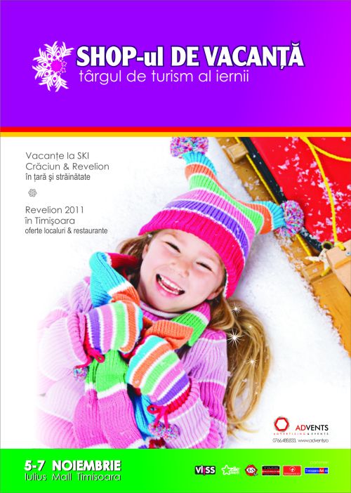 A sasea editie a „Shop-ului de vacanta”, targul de turism al iernii, se desfasoara in perioada 5-7 noiembrie, la Iulius Mall Timisoara. Cele mai tentante oferte de iarna vor fi prezentate publicului timisorean la evenimentul de turism al iernii din acest weekend. Organizat de agentia ADVENTS, targul reuneste ofertele celor mai importante agentii de turism din Timisoara, dar si pachetele speciale ale aquaparcului din Szeget, Aquapolis.