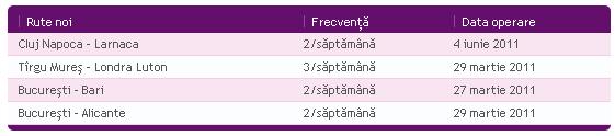 Compania aeriana low-cost Wizz Air a anuntat ca incepand cu martie 2011 va lansa 4 noi rute din si spre Romania, si anume: din Cluj Napoca spre Larnaca (Cipru), de la Targu Mures spre Londra Luton (Marea Britanie) si de la Bucuresti catre Bari (Italia) si spre Alicante (Spania).